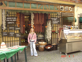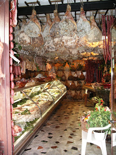 Сверху болтается prosciutto,свежее мясо обваленное в специях и соли и оставленное вялиться на солнце , иногда его вялят еще над дымом. мясо с этих лодыжек срезают тонюсенькими пластами и едят с дыней. Я еще часто выставляют тарелочки с нарезанной колбасой или сосисками на пробу на улице около магазина.И это при том, что и сосиски висят на улице.На фото надпись около сосисок "Palle del nonno" означает "Дедушкины яйца", ничего себе продукт.